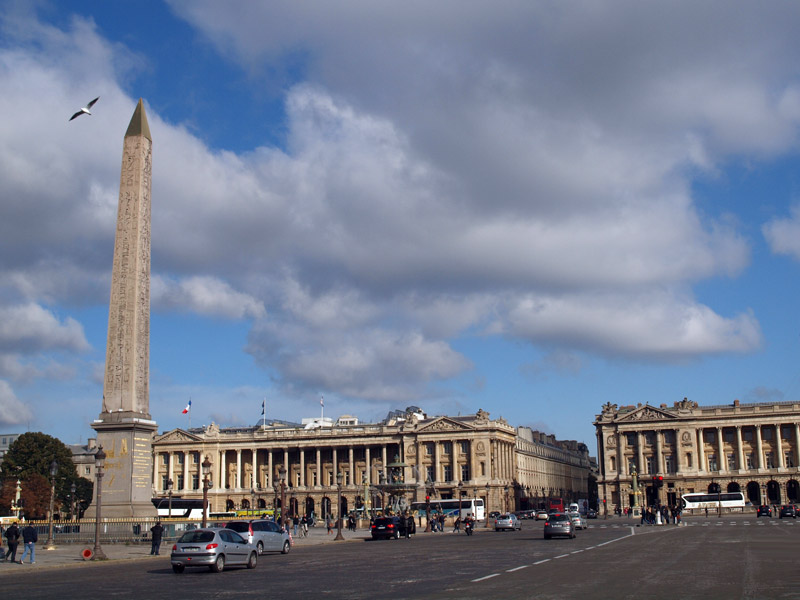 Place de la Concorde (Trg sloge, 8. arondisman, desna obala) je ogroman – zapravo najveći trg u Parizu. Kud god se okreneš, vidiš mnoštvo znamenitosti. Trg je izgrađen, kako bi kralj Luj XV. imao odgovarajuće mjesto, na kojem će postaviti svoj ogroman kip. No njegov kip se nije dugo zadržao na trgu, nepunih dvadeset godina kasnije, uklonili su ga francuski revolucionari i na njegovo mjesto postavili zloglasnu giljotinu (kojom su, između tisuća ostalih, za glavu skratili i njegovog unuka Luja XVI.). Danas se na sredini trga nalazi “najstariji pariški spomenik” – egipatski obelisk. Tu su i dvije, ženskim skulpturama ukrašene fontane.