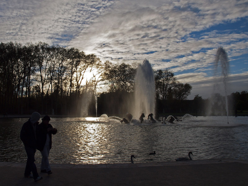 Danas je zadnji dan održavanja vodene predstave u parku dvorca. Još samo danas, prije zimske pauze, vodoskoci će izbacivati vodu uz glazbenu pratnju iz zvučnika vješto skrivenih u zelenilu podrezane živice. Na početku parka su dvije vodene površine u kojima se zrcali pročelje dvorca. Park, koji u potpunosti slijedi grandioznost dvorca, je geometrijski pravilan i simetričan a njegovom sredinom vodi široka staza od koje se odvajaju puteljci prema šumarcima, fontanama, kolonadama, drvoredima, jezerima, paviljonima, vodoskocima, sve dotjerano i ukrašeno mramornim skulpturama. Jesenje boje tek su zagrizle zelenilo podšišanih krošanja. Zalazeće sunce prohladnog dana baca dugačke sjene a brončanim skulpturama u fontanama daje zlatni štih.