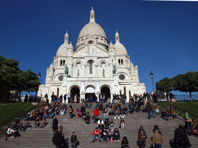 Od Eiffelovog tornja idemo autobusom (ipak se vidi više nego iz podzemne željeznice) do Place de Clichy, od kuda se penjemo na Montmartre. Montmartre (Brdo mučenika), s visinom od 127 metara, najviši dio Pariza, nosi naziv po kršćanima koji su ovdje u ranijem rimskom dobu mučeni i ubijeni. Na samom vrhu nalazi se velika bijela rimokatolička bazilika Svetog srca (Sacré-Coeur) izgrađena početkom 20. st. Od podnožja brda do bazilike vodi strmo stepenište, a od nedavno i uspinjača. Na prostoru ispred crkve ima nekoliko vidikovaca s kojih se Pariz vidi kao na dlanu. Vidik je lijep i sa stepenica koje su inače omiljeno mjesto za odmor i sunčanje.